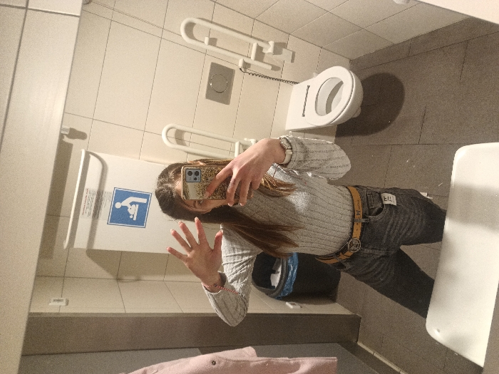 - "A female-presenting individual is depicted taking a mirror selfie in a public restroom located in Targovishte, Bulgaria" by FM-JPM2z2, licensed under CC BY 4.0