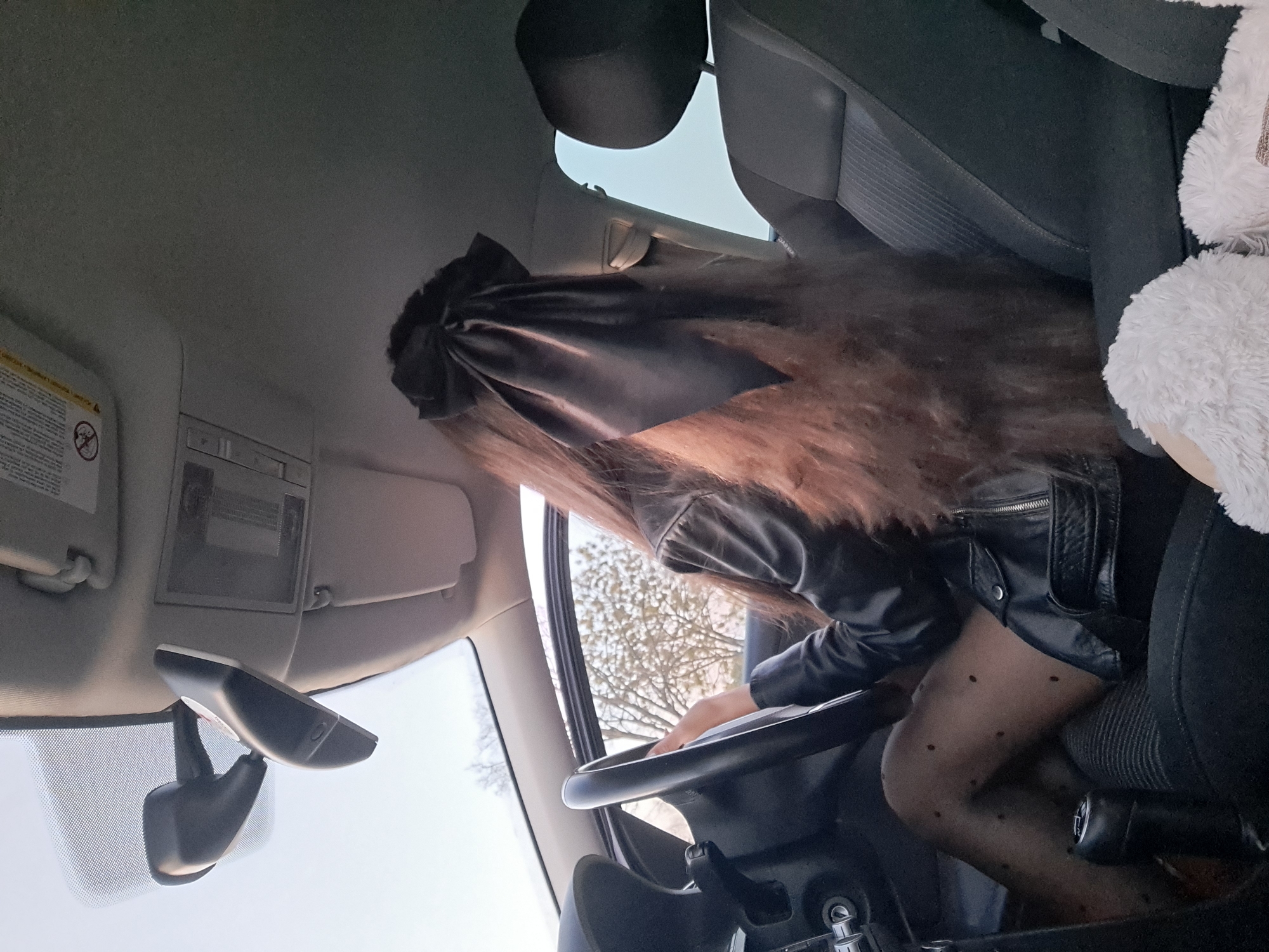 A woman is seated in the driver's seat of a car. She is wearing a black leather jacket and patterned tights. Her hair is long and reddish-brown, adorned with a black bow. The interior of the car is visible, including the steering wheel, rearview mirror, and part of the dashboard. Outside the car window, a tree and sky are visible. The location is not definitively determined to be Lokorsko, Bulgaria; this information is inferred only by prior knowledge and cannot be determined from the image itself.