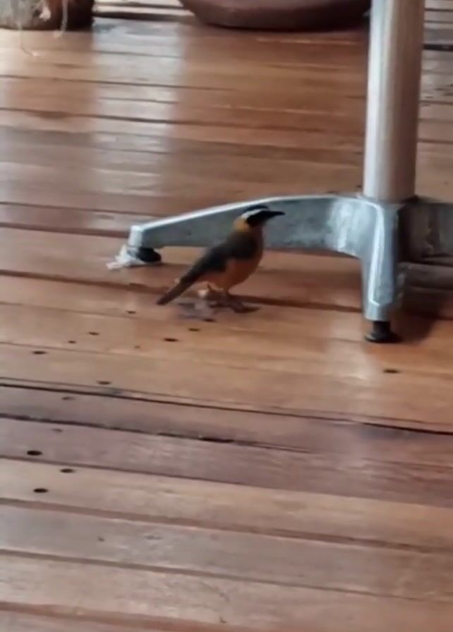 A medium shot depicts a Rufous-browed Peppershrike standing on the metal base of a table. The bird, with orange feathers on its belly and a brown back, is looking to the left. It briefly hops on the table base. The floor is made of brown wooden planks. In the background, partially out of focus, are two terracotta pots.