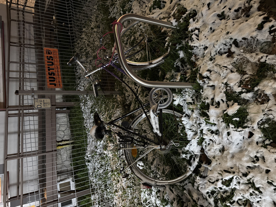 A bicycle is locked to a metal bike rack near a chain-link fence. Light snow covers the ground around the bike rack. The bike is mostly black with purple accents and has a silver kickstand. A sign with the word "JUSTUS" is attached to the fence. A small sign with numbers and symbols is visible below the "JUSTUS" sign. The ground is a mix of grass, snow, and possibly some fallen leaves.