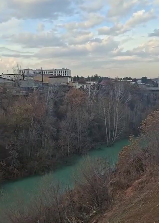 The scene is a somewhat high-angle shot of a murky, light green river flowing through a low-lying valley. The riverbanks are covered in a dense thicket of bare trees and dry vegetation. On the far side of the valley, some low buildings and a tall white building are visible, set against a sky lightly dotted with clouds. A bridge carrying vehicular traffic can be seen in the distance. The overall tone is muted and a bit bleak, owing to the time of year and the color of the water. The perspective is static, with the camera not moving during the shot.