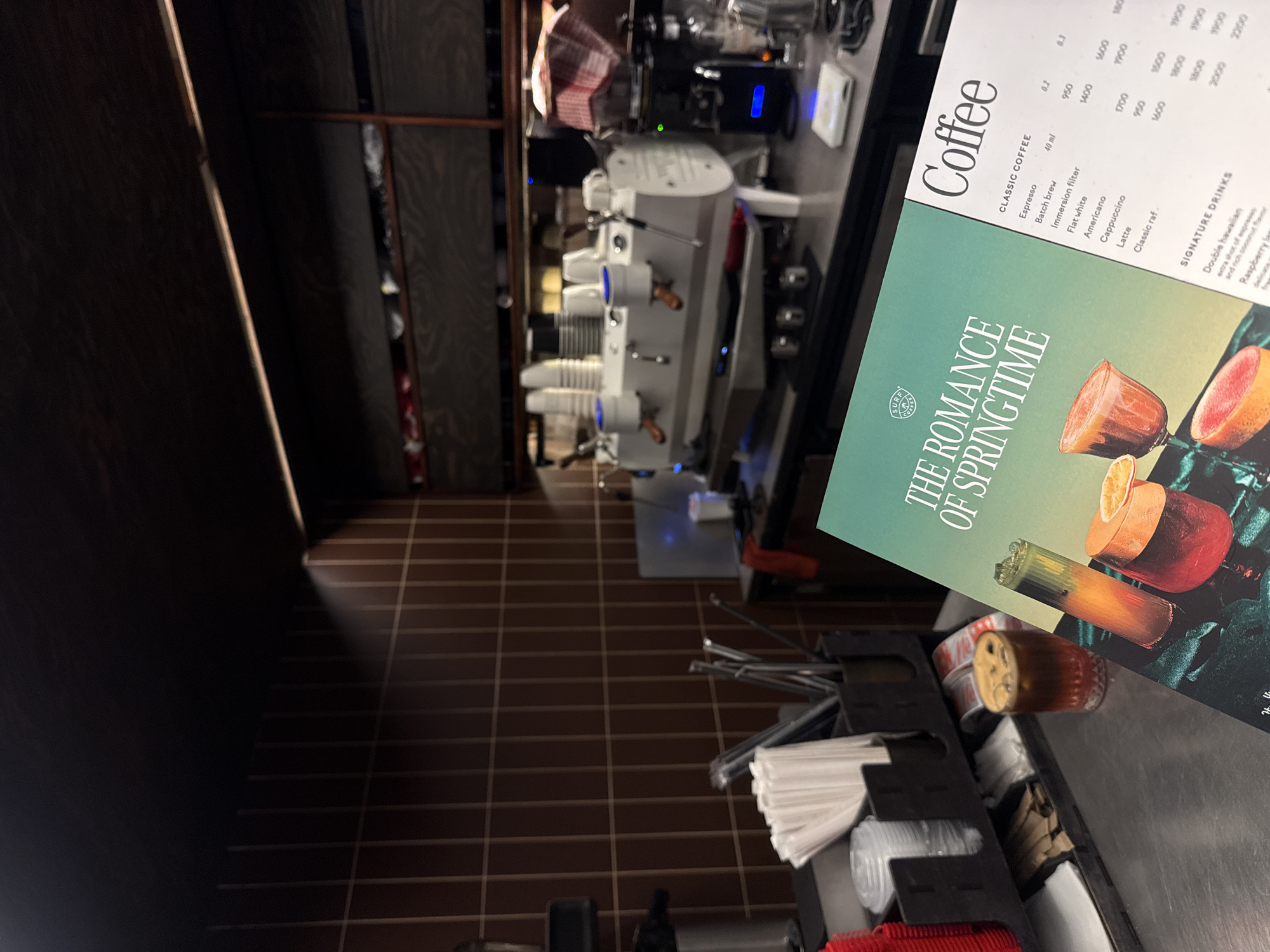 - "This indoor scene shows a café or coffee shop in Yerevan, Armenia, with a menu titled "Coffee" and a promotional message "The Romance of Springtime" by FM-ojRhr2, licensed under CC BY 4.0