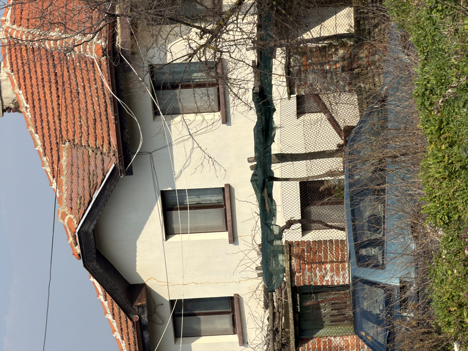 The image depicts a residential scene in Kermen, Bulgaria. A two-story building with light-colored, possibly stucco, exterior walls and a red clay tile roof occupies the central and upper portions of the frame. The roof tiles exhibit displacement and weathering. A dark-colored eaves structure with exposed wood soffit is visible beneath the roofline. Two rectangular, dark-framed windows with brown sills are prominent on the upper story facade; multiple white electrical wires are strung horizontally across this facade. Vertical cracks are visible in the stucco on the left side of the upper story. In the lower mid-ground, a partial auxiliary structure is visible, featuring exposed red brick on the left and a weathered, dark green wooden double door. Above this, a crude overhead trellis structure, supported by wooden posts, is covered with dark green mesh material and intertwined with bare vine branches. A chain-link fence runs behind this structure. In the lower foreground, a light blue minivan or station wagon is partially obscured by dense, dry, leafless vegetation and green ground cover. Bare tree branches extend from the right side of the frame, casting shadows across the building. The sky above is clear and light blue. No people are visible.
