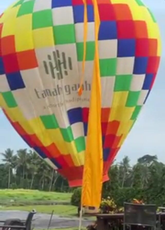 A colorful hot air balloon is tethered to the ground outside. The balloon is decorated in a checkered pattern with the resort's name, "tanah gajah," printed on its side. A long yellow streamer hangs from the top. The view is taken from a covered patio, with chairs and tables visible in the foreground. In the background, there's a green, grassy field and palm trees under a cloudy sky.