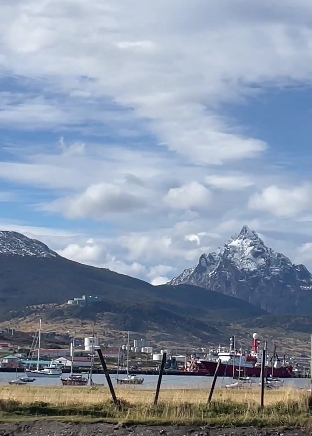 scenic view of a town nestled in front of mountains partially covered in snow. The town appears to be near a body of water, as there are several boats and a red ship visible in the harbor. In the foreground, there's a simple wire fence with posts, followed by a strip of dry grass and a paved walkway. A speed limit sign indicating "20" is prominently displayed. The sky is blue with scattered clouds, adding to the picturesque landscape. The camera pans slightly to the right, revealing more of the town and the mountainous backdrop.