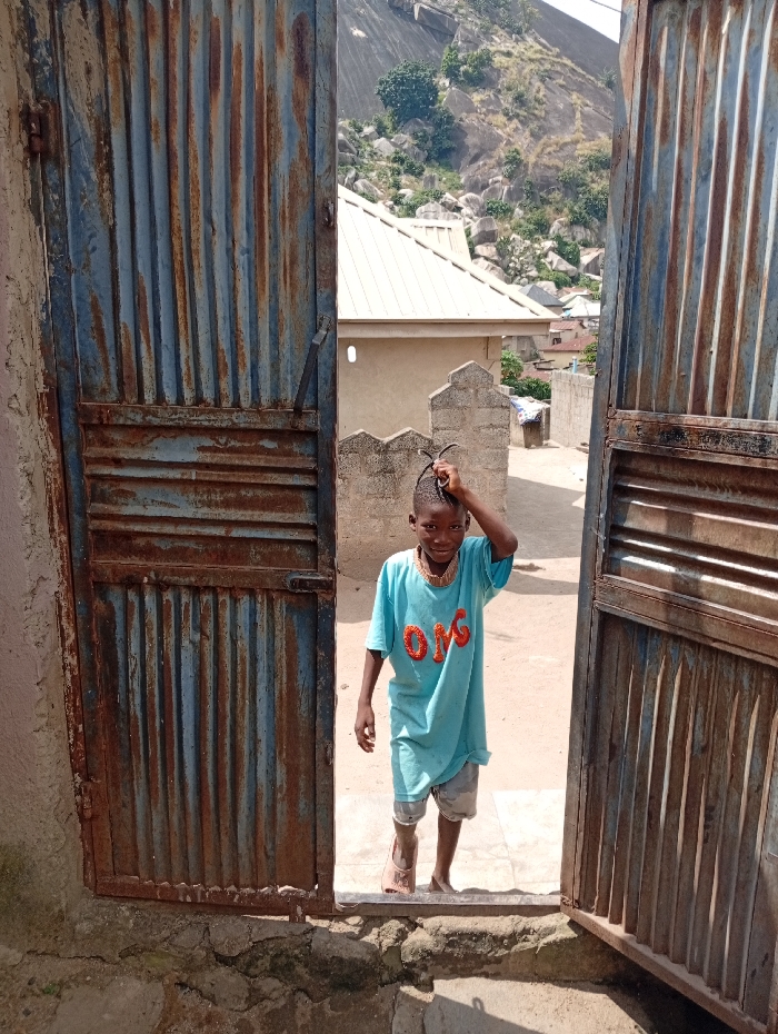 A young child, approximately 5-10 years old, stands centered in an open, heavily rusted, blue and reddish-brown corrugated sheet metal gate. The child wears an oversized light blue t-shirt with "OMG" in orange letters on the front, and worn, patterned shorts. One light brown sandal is on the right foot, while the left foot is bare. The child's right hand rests on top of their head, where dark hair is styled upwards. The child looks directly at the viewer with a slight smile. The gate's concrete threshold shows cracks. Beyond the gate, a light-colored building with a sloped roof and a short cinder block wall is visible. In the background, other residential structures with various roofs are present, culminating in large, rocky hills with sparse vegetation under a bright sky, characteristic of the Madalla, Nigeria environment. The scene is outdoors under natural daylight.