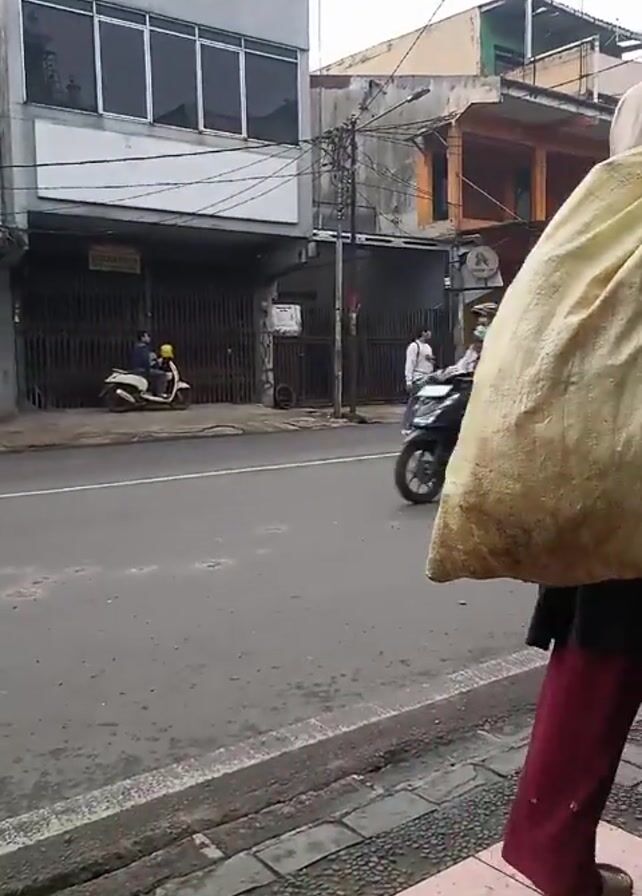 street scene in what appears to be an urban area. A person is standing on the sidewalk carrying a large, yellowish bag over their shoulder. The person is wearing a head covering, a dark jacket, and red pants. There is a street with motorbikes and a car driving by. Buildings are visible on both sides of the street, some with closed metal gates. One person is walking across the street.