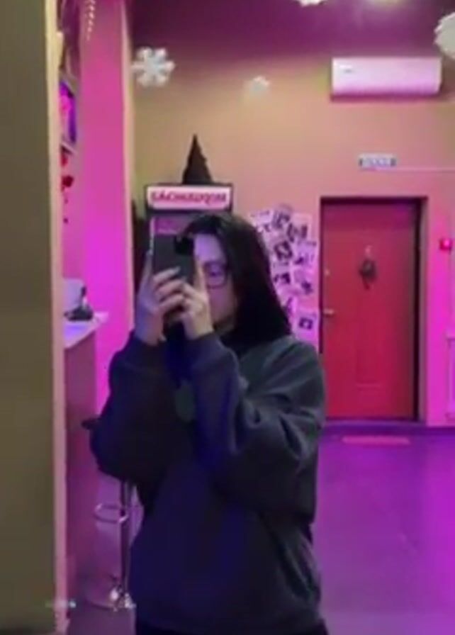 person taking a selfie in a mirror. The person has dark hair and is wearing glasses and a gray hoodie. They are holding a phone in front of their face. The background is a room with pink and purple lighting. There is a door, posters on the wall, and Christmas decorations. The person is fixing their hair in the video.