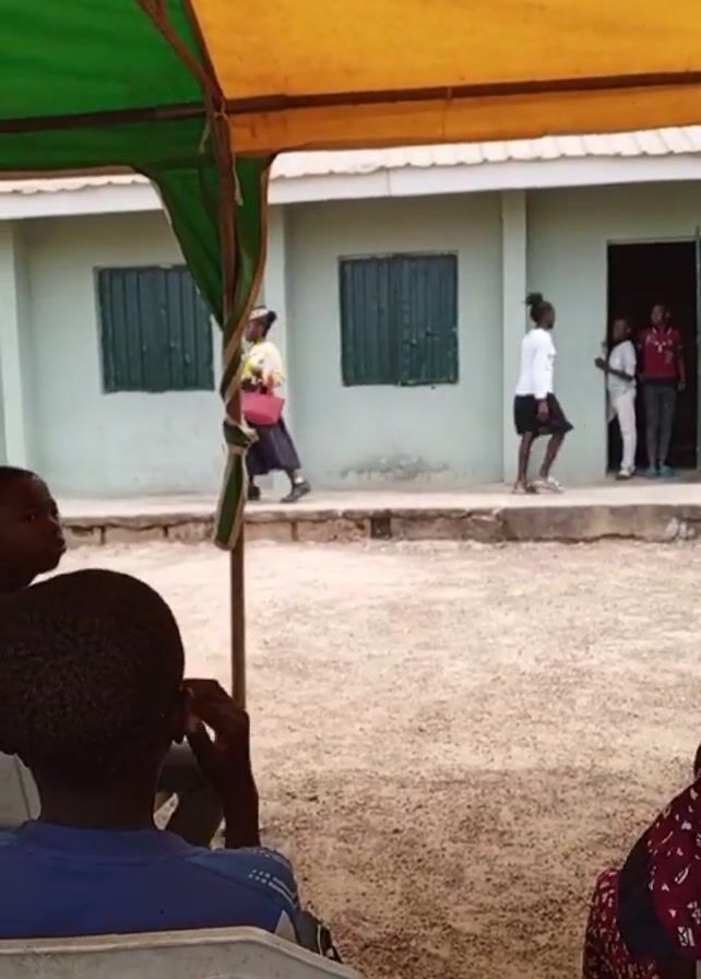Children sit on white plastic chairs under a yellow and green tent, facing a light green building with dark green windows and doors. A woman in a long skirt, light-colored blouse, and headdress walks on a concrete walkway in front of the building, carrying a green object in her right hand. Other people are visible in the doorway of the building. Several children clap their hands. The ground is dirt.