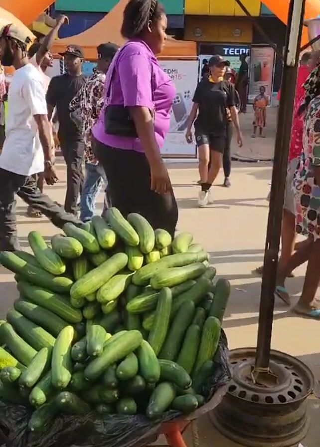 street scene, likely in a city or town, with a fruit vendor prominently positioned in the foreground. The vendor's cart is filled with a large pile of green cucumbers. Behind the cart, numerous people walk by, suggesting a busy street or market area. In the background, an orange archway with the Xiaomi logo is visible, along with a white tent. This indicates some sort of event or promotional activity is taking place. The video has an active and bustling atmosphere due to the movement of people and the presence of commercial activity.
