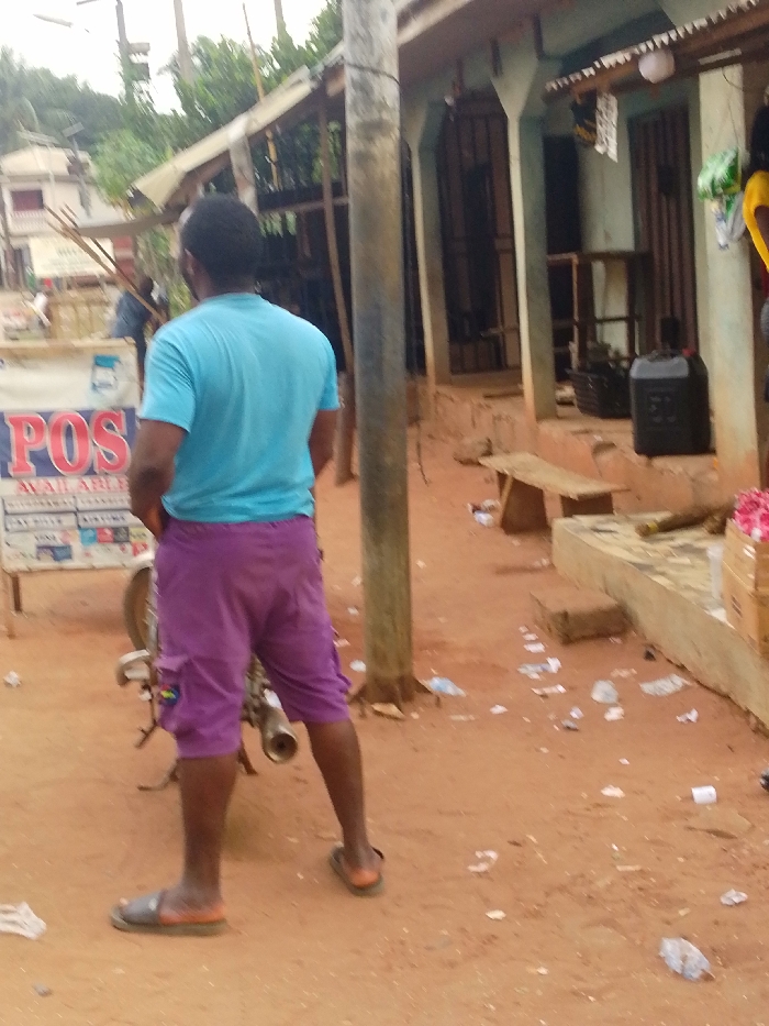 The scene depicts an unpaved street in Umuoji, Nigeria, with reddish-brown earth serving as the ground surface, marked by scattered white and clear plastic refuse. A dark-skinned male, with short dark hair, is centrally positioned, facing slightly right with his back partially to the camera. He wears a light blue short-sleeved t-shirt, purple cargo shorts, and dark sandals. A silver-colored motorcycle is positioned directly behind him, with its exhaust pipe visible between his legs. To the left, a white and blue sign with "POS AVAILABLE" in red lettering is visible. A weathered wooden utility pole stands vertically in the midground, to the left of the central male figure. In the background, on the right, a single-story building with a faded green or blue facade, featuring a raised concrete foundation and a corrugated metal roof, appears to be a commercial establishment or dwelling. Multiple entrances or windows with security bars are visible. A plain wooden bench rests on the ground directly in front of this building. On the raised platform of the building, a large black plastic jerrycan and a woven basket are present. A second, partially obscured individual is visible near the far-right entrance of the building. Further in the background, additional buildings and dense green foliage are observable under an overcast sky.