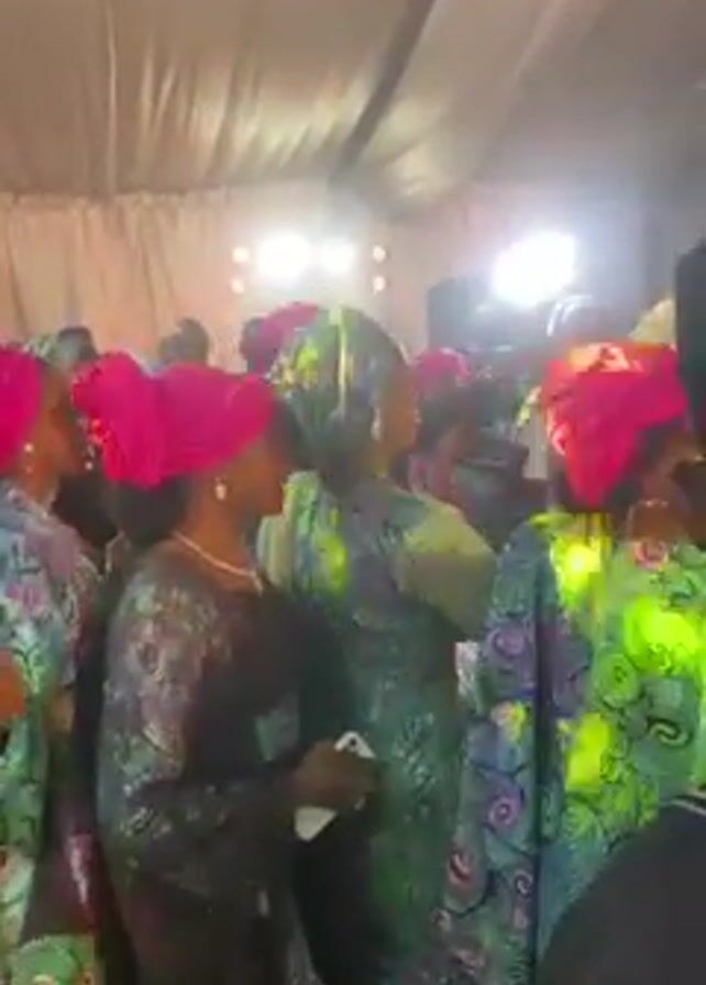 group of people, primarily women, dancing indoors, possibly at an event like a wedding reception. The women are wearing similar green and purple patterned outfits and pink headwraps. They are moving rhythmically, likely to music that is audible in the background. Some are using their phones, possibly to record or take pictures. A few men in black attire can be seen in the periphery. The room is covered by a white tent-like structure, and bright stage lights are pointed towards the crowd. The scene conveys a festive atmosphere.