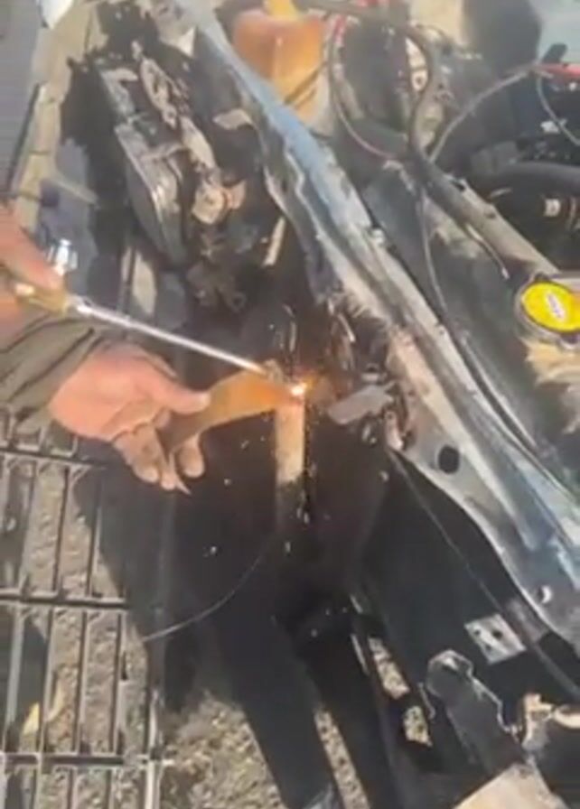 man using a torch to cut a metal piece on the front of a damaged white car. The front of the car is missing parts, and the engine is visible. The man is holding the torch in his right hand and a metal piece in his left hand. Sparks are flying from the area where the torch is cutting. The man has short dark hair and a beard. He is wearing a dark jacket. There is another car parked behind the damaged car. The scene appears to be taking place outdoors, possibly at a junkyard or repair shop. A metal shopping cart is visible in the foreground.