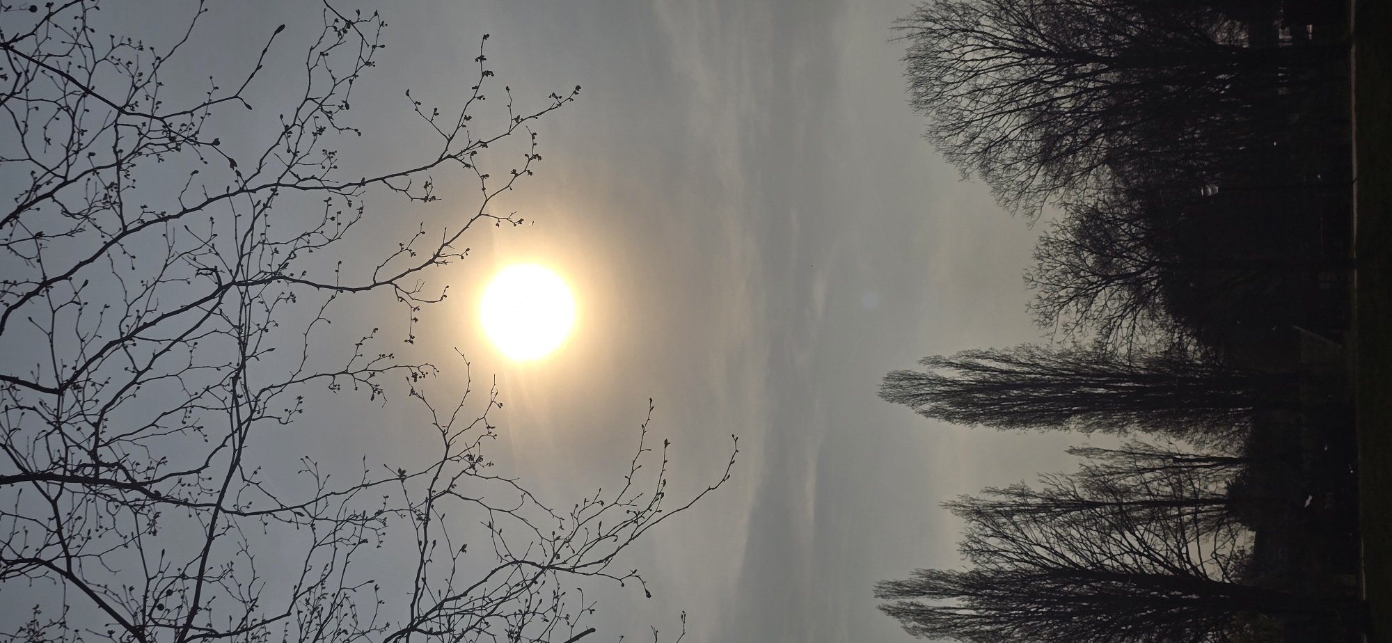 The image captures an outdoor park scene in Les Ulis, France, under a hazy sky. A bright, diffused sun is prominently positioned in the upper center of the frame, emitting a yellowish glow through atmospheric haze or thin clouds. In the immediate foreground, dark, bare tree branches with numerous small buds extend across the top of the image, silhouetted against the sky and partially obscuring the sun. Along the midground horizon, a row of additional trees stands silhouetted, characterized by their bare branches. On the left side of this row, several tall, slender, columnar trees are visible, while the right features denser, more rounded tree canopies. The lower section of the image shows an indistinct, dark ground area, likely vegetation, heavily shadowed. No individuals, animals, or man-made structures are clearly discernible beyond the trees. The overall lighting and appearance of the trees suggest either late winter or early spring.