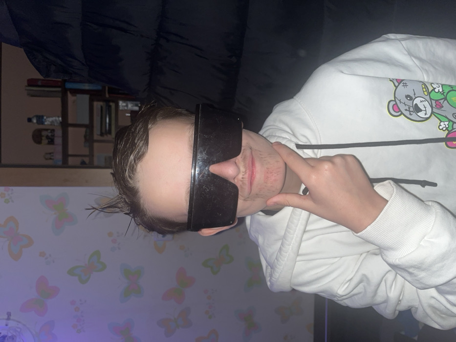 An individual, appearing to be a young person, is depicted in a medium shot indoors, purportedly within Sofia, Bulgaria. The subject faces forward, wearing oversized black rectangular sunglasses that obscure the eyes and upper nose. A light brown, drawn-on mustache is visible above the upper lip, and sparse, light brown drawn-on stubble or a beard is present on the chin. The subject's hair is short, dark, and styled with several small spikes on top. They are wearing a white hooded sweatshirt featuring a graphic design of a stitched, grey teddy bear with colorful accents on the lower right side. The right hand is raised, with the index finger touching the chin in a contemplative or posed gesture. The background on the left consists of a light-colored wall adorned with numerous pastel butterfly decals in shades of pink, yellow, blue, and green, with a faint purple light cast upon it. To the right, a dark, possibly padded garment or jacket partially obstructs the view. Behind this, a doorway or opening reveals a dimly lit wooden shelving unit containing various items, including a clear plastic water bottle, books, and other indistinct objects.