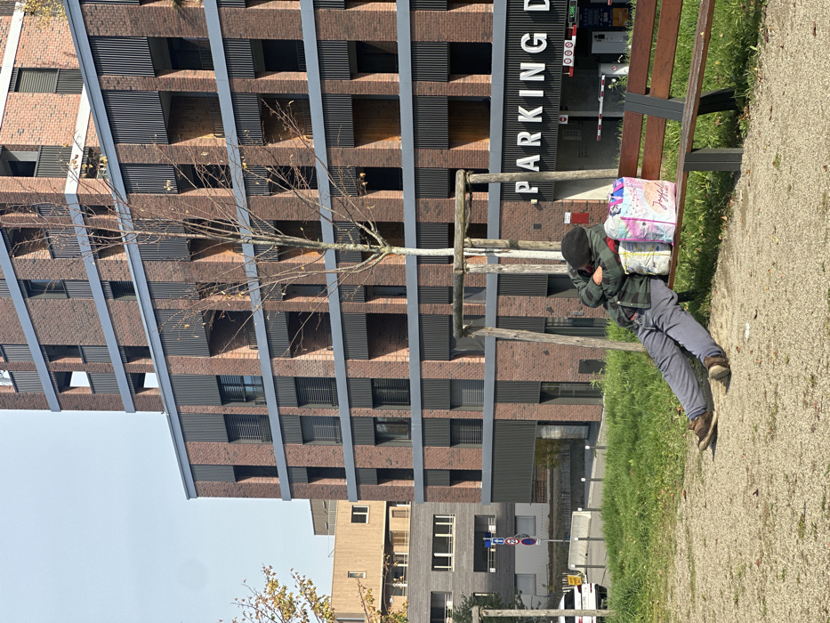 An individual is depicted sleeping on a public park bench in the Presqu'île Malraux district of Strasbourg, France. The person wears a dark beanie, a dark green patterned jacket over a red garment, light gray pants, and brown shoes, with their head resting on crossed arms and face obscured. Three shopping-style bags—one white, one yellow, and one pink with "Joyful Dreams" text—are placed on the dark brown wooden bench beside them. The bench is situated on a gravel surface adjacent to a grassy area. Behind the bench, a young, bare deciduous tree is held by a three-post wooden support structure. In the background, a prominent multi-story modern brick building features dark gray horizontal bands and vertical dark louvers, indicative of balconies or recessed windows. To the right of the tree, an entrance marked "PARKING D" with a red and white barrier and a digital display showing "000" leads into an underground parking structure. Further left in the background, other modern buildings, one with light wooden cladding and another dark-colored, are visible. A white car is parked on a paved section to the far left, bordered by concrete bollards, with a circular "20" speed limit sign nearby. The scene is illuminated by clear daylight under a blue sky.
