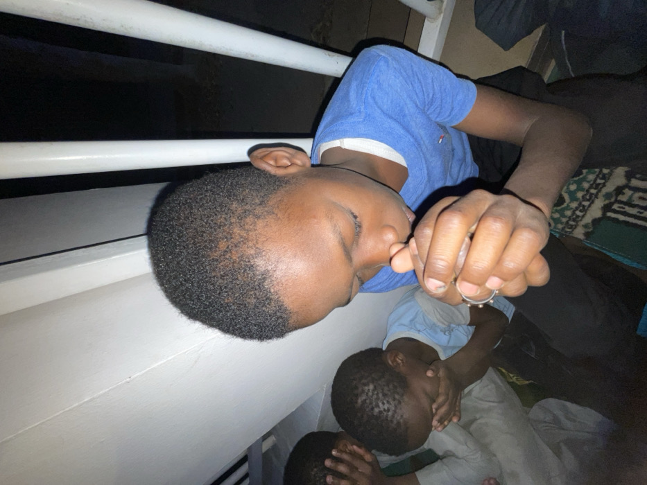 In Gandu Albasa, Nigeria, a dimly lit indoor or covered environment features three young males in postures of reverence. The central and most prominent subject, an adolescent male, is seated, wearing a blue short-sleeved t-shirt and dark trousers. His head is bowed, and his hands are clasped together near his mouth; a silver-colored ring with small spherical details is visible on his right index finger. He is positioned on a green patterned mat. To his left, two other young males are partially visible, with their faces covered by their hands in a similar reflective or prayerful stance. One wears a light blue top, and the other a light-colored garment. White vertical and horizontal structural elements, resembling railings or wall panels, are present in the background against a dark backdrop.