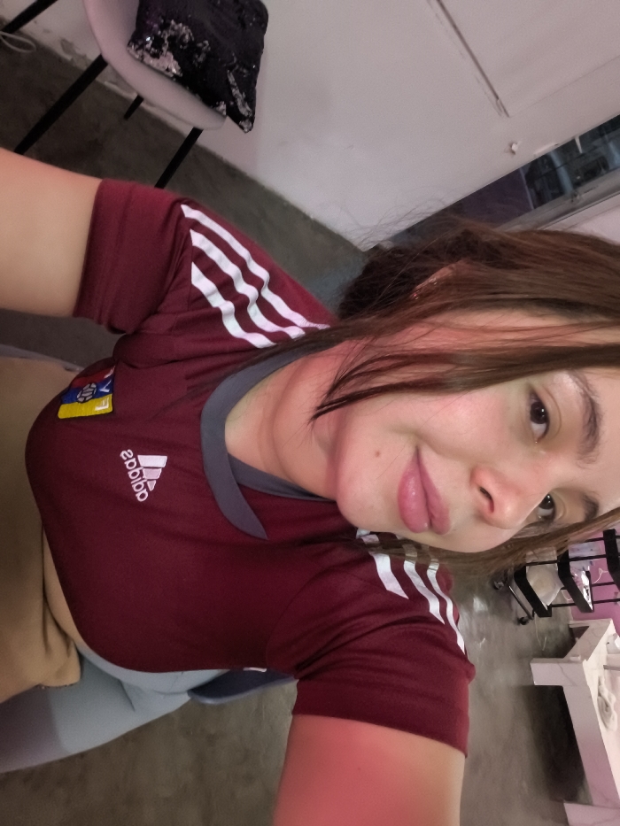 A female subject, appearing to be in her 20s or 30s, is depicted in an indoor selfie, looking directly into the camera with a slight smile. She has long brown hair, partially obscuring her right eye, and visible pink lips. She is wearing a maroon short-sleeved t-shirt with the white Adidas logo on the chest, three white stripes on the sleeves, and a small multi-colored emblem on the left chest area. A light brown garment and a light gray fabric are visible below her waist. The background features a light-colored wall and a gray, concrete-like floor. To the upper left, a white chair with a black, possibly sequined, object resting on it is visible. To the right, a white table or counter with a thick base and indistinct white objects on its surface can be seen. The specific location within Altagracia, Venezuela, is not discernible from the visual information in the image.