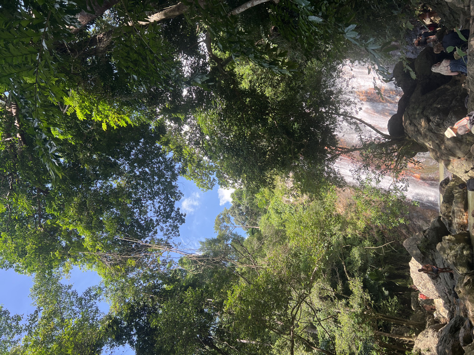 A dense canopy of lush green trees frames a view of a waterfall with reddish-orange streaks down its face. Patches of blue sky peek through the leaves. On the right, rocky terrain with people gathered around the waterfall's edge is visible. The perspective is looking up, emphasizing the height of the trees and waterfall.