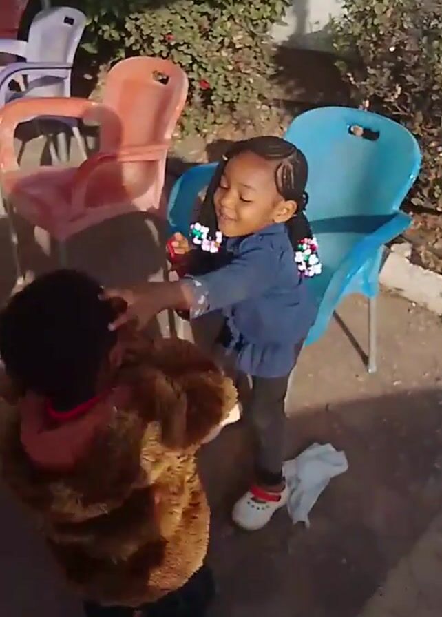 Two young children play outside on a sunny day among several empty colorful plastic chairs. A girl wearing a blue denim jacket and braided hair extensions with colorful beads sits in a blue chair, while a young boy in a brown fuzzy jacket walks around. Initially, the girl reaches out towards the boy. After a brief interaction, the boy picks up a cell phone from the ground and examines it. The girl then begins playing with a red object, holding it and aiming it like a bow. In the background, there are other adults seated in similar plastic chairs, seemingly observing the children. The setting appears to be an outdoor patio or waiting area, with some greenery visible in the background.