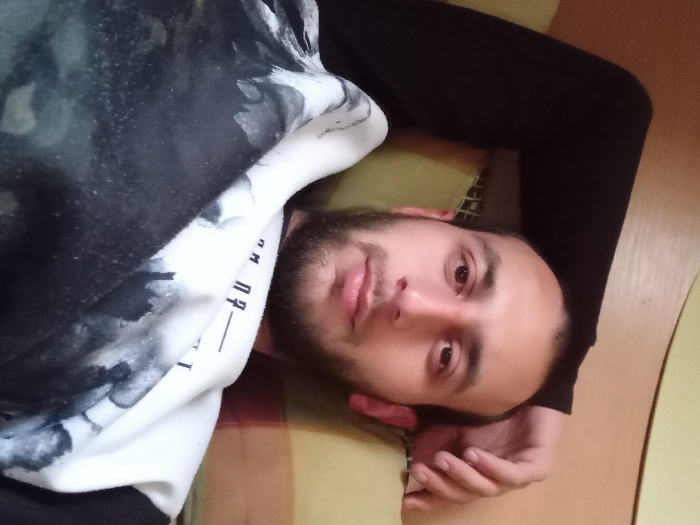 An adult male with short dark hair, a dark beard, and a mustache is depicted from the chest up, facing directly towards the camera. He is reclining indoors, positioned against soft furnishings. His left arm is bent, with his hand resting near his head. He wears a long-sleeved garment featuring black sleeves and a white torso area with a black and grey abstract design and visible indistinct text. The background includes a light-colored wooden surface in the upper left and various soft cushions or textiles, appearing in shades of lime green/yellow and brownish-orange. The specific location within the city of Provadia, Bulgaria, cannot be determined from the visual evidence presented in the image.