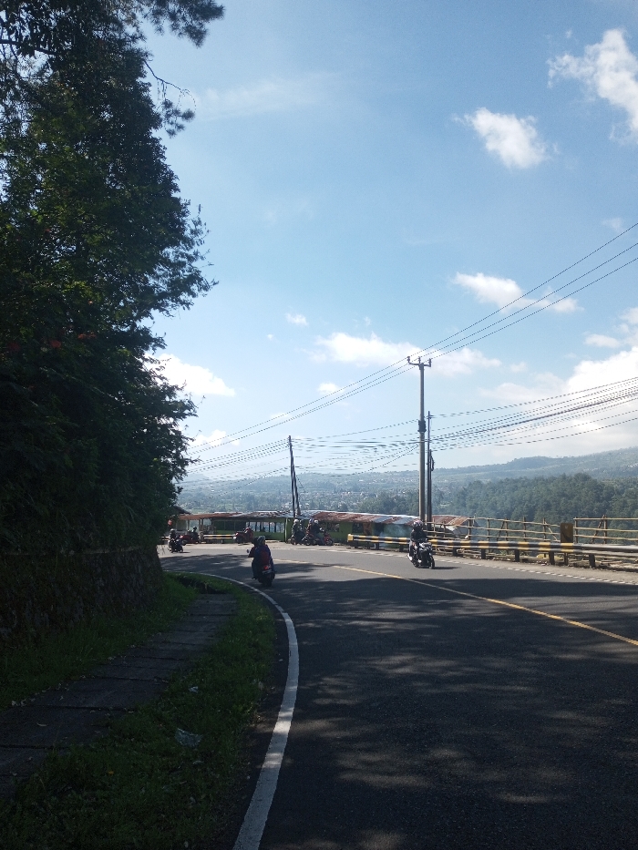 This image depicts a sunlit outdoor scene along a paved road in Ka Thaung (Upper), Myanmar, on a clear day with scattered cumulus clouds. The asphalt road, marked with a solid white edge line and a double solid yellow center line, curves gently to the left from the viewer's perspective. Shadows from unseen objects extend across the road. On the left, a dense, dark green embankment covered in foliage, including large trees and smaller shrubs, rises sharply, supported by a low concrete retaining wall at its base. A narrow, unpaved shoulder separates the embankment from the road. On the right side of the road, a yellow metal guardrail runs along the edge, overlooking a valley or lower terrain. Beyond the guardrail, a panoramic view reveals a landscape of green hills and scattered buildings, indicating a town or village. Adjacent to the road and behind the guardrail, several rudimentary structures with corrugated metal roofs are visible, appearing as roadside stalls or shelters. Two wooden utility poles, strung with multiple power lines, stand upright along the right side of the road, extending across the frame. Several motorbikes are present on the road. One dark-colored motorbike with a rider in a dark helmet is in the midground, navigating the curve away from the viewer. Another motorbike, also dark and ridden by an individual in a dark helmet, is further down the road. Multiple other motorbikes are parked or stationary near the roadside structures on the right, with riders visible. The scene suggests an active thoroughfare or a popular stopping point along a scenic route.