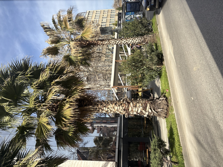 The image depicts an urban street scene in Plovdiv, Bulgaria. In the foreground, a gray asphalt road surface is visible, showing a faint white directional arrow. This road is bordered by a narrow green grass strip, featuring small shrubs and three mature palm trees with thick, fibrous trunks and green, fan-shaped fronds. The leftmost palm tree is partially cropped on the left edge. To the left, a modern building with a predominantly reflective glass facade reflects portions of the sky and surrounding structures. To the right of the central palm tree, an outdoor seating area is present, characterized by multiple white awnings, tables, and chairs. One indistinct human figure is partially visible within this outdoor area, positioned behind a tree trunk. Further right on the road, a dark-colored vehicle, identifiable by a Bulgarian license plate beginning with "PB 11", is partially visible and facing away from the viewer. Adjacent to the vehicle, a dark-colored advertising kiosk or billboard stands. In the background, a multi-story building with a light-colored facade and numerous windows is visible, along with several leafless deciduous trees against a blue sky with scattered white clouds.