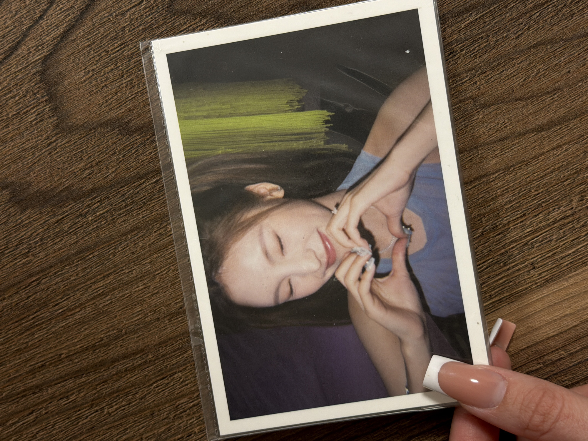 A photograph shows a woman holding a photo card. The photo card depicts a person with their eyes closed, hands near their face, wearing a blue shirt. The background of the photo card is dark with a horizontal green streak at the top. The card is enclosed in a transparent protective sleeve. The woman holding the card has manicured nails with a french tip design. The background is a wooden surface with visible grain. The location of the scene is unspecified.