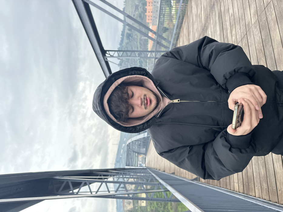 A young adult male is depicted standing on the wooden pedestrian walkway of the Ponte Rodoviária de Peso da Régua (Régua Road Bridge) in Peso da Régua, Portugal. He is positioned centrally in the frame, wearing a black puffer jacket with the hood drawn up over a light pink hooded sweatshirt. The male has dark, curly hair, a moustache, and a soul patch. Both hands are engaged in holding a smartphone horizontally, and his gaze is directed downwards towards its screen, indicating interaction with the device. The background reveals the dark grey metal truss structure of the bridge receding into the distance on both sides. Beyond the bridge, under an overcast sky, are distant hills characteristic of the Douro Valley, featuring areas of green vegetation and some visible urban development. The scene is illuminated by diffused light, consistent with an overcast day.