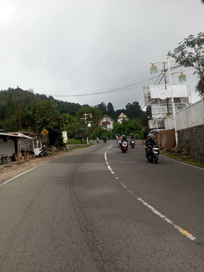 The image depicts a two-lane asphalt road curving to the right, under an overcast sky, in Phoxay, Laos. A broken white line separates the lanes, with a faded yellow dashed line running parallel to the right shoulder near the foreground. On the road, a line of approximately seven motorcycles is moving away from the viewer. The lead motorcycle, black, carries two individuals wearing dark clothing and helmets. Behind it, a red scooter with a single rider in a helmet follows, and other motorcycles with riders are visible further back. All riders appear to be wearing helmets. To the left of the road, a small, light-colored wooden structure with a corrugated metal roof stands close to the pavement. Two individuals are seated on a wooden bench outside this structure. A dark motorcycle is parked nearby. Behind these structures, dense green foliage covers a steep hillside. A utility pole with multiple wires is present, and a yellow triangular warning sign with a black arrow pointing right is affixed to a pole amidst the vegetation. To the right of the road, a stone retaining wall borders the shoulder, leading up to a white, painted block wall. A large, white billboard-like structure with a faint emblem or text is visible above the wall. A white streetlight pole with two ornate, lantern-style fixtures extends over the road. Further back, several houses with distinct architectural styles, including one with a brown facade and another with a yellow turret-like roof feature, are nestled among the trees on a distant hillside. The background features forested mountains receding into the misty, cloudy sky.