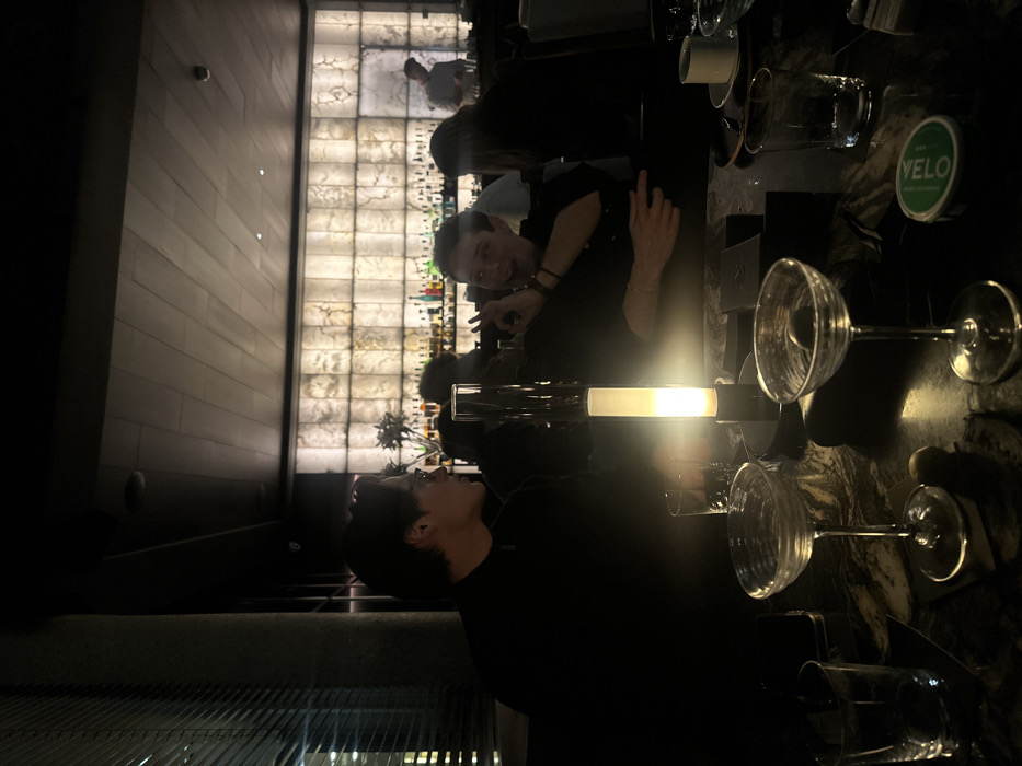 Inside a dimly lit bar with a marble-like countertop, two people are visible. One is seated and looking up, and the other standing behind, smiling and giving a peace sign. Behind them, a brightly lit bar display showcases an array of bottles. The table features empty cocktail glasses, a Velo nicotine pouch tin, and a small lamp. The setting suggests an evening social gathering.