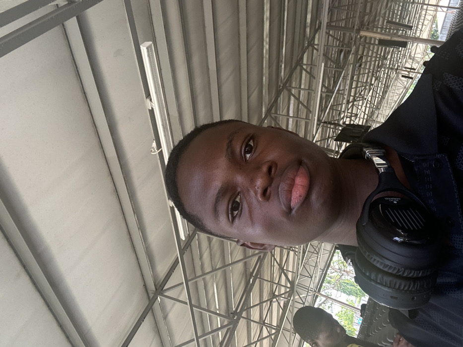 The image depicts a close-up, upward-angled view of a young male individual in Ozuaha, Nigeria. The primary subject, with a dark complexion and short dark hair, is centered in the frame, looking directly at the camera with a neutral expression. He has full lips and a small visible mark on his right cheek area. Around his neck, resting on his shoulders, are black over-ear headphones with silver accents. He is wearing a dark, collared shirt with a subtle textured pattern. In the lower-left background, the top of a second individual's head and shoulder are partially visible; this person also has a dark complexion and short dark hair and appears to be looking downwards. The environment suggests an indoor or semi-outdoor covered space, characterized by a light-colored ceiling with visible metal structural beams and trusses. Multiple linear fluorescent light fixtures are attached to the overhead structure. Beyond the immediate structure, green foliage is visible, and several dark, rectangular objects are suspended from the ceiling in the mid-ground.