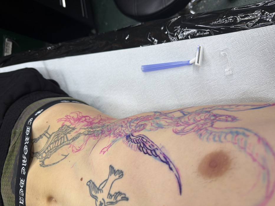 The image displays a close-up, angled view of an individual's left torso, from the lower abdomen to the rib cage and hip area, consistent with a tattoo studio environment. The person, with light-toned skin, is positioned on a white paper-covered surface. Dark underwear with a white band featuring gothic-style text, partially legible as "EDIT DUFOR," is visible along the top edge of the frame. The torso exhibits existing tattoos: a faded, linear outline of a bird-like figure is present on the upper abdomen, and a more complex, grey-scale design, appearing skeletal or mechanical, is located on the upper left hip. A new, intricate tattoo design has been stenciled across the side of the torso, outlined in overlapping pink and blue ink, depicting organic, serpentine, and wing-like forms. A single nipple is visible on the lower left of the frame. To the immediate right of the torso, on the white paper, rests a disposable razor with a translucent light blue handle and its detached clear plastic blade guard, indicating recent hair removal. The background on the right side of the image features a dark, possibly black, vinyl-covered surface, likely a chair or armrest, draped with black plastic sheeting, and a section of a dark green wall. The image itself does not contain specific visual identifiers to confirm the location in Milan, Italy.