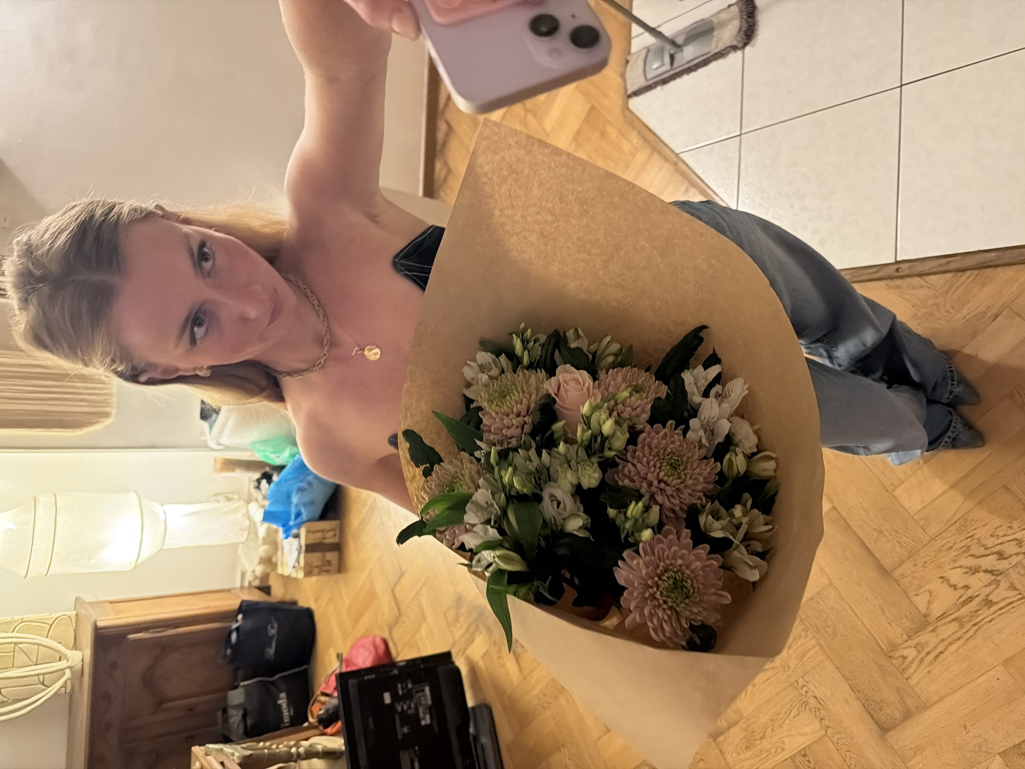 A young woman with fair skin and blonde hair pulled back from her face is taking a selfie with her phone. She is holding a bouquet of flowers in a brown paper wrap. She is wearing a gold necklace with a pendant. The location appears to be indoors, with parquet flooring and white tile visible in the background. A radiator and various personal items are visible in the background. The setting does not provide enough information to definitively determine if the location is in Paris, France.