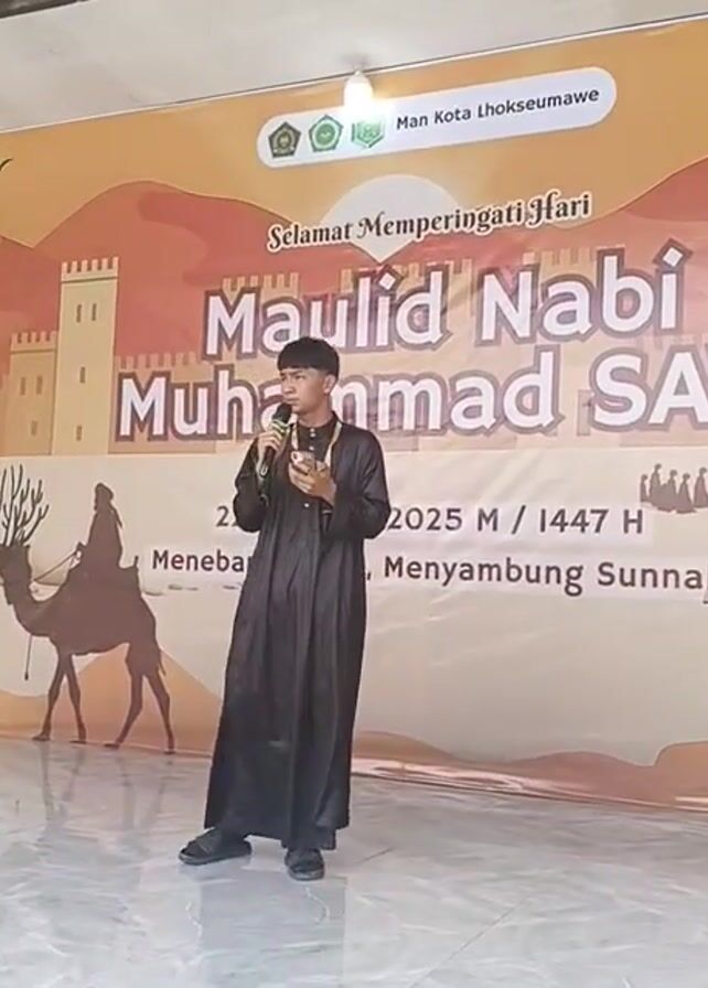 A young male stands in front of a Maulid Nabi Muhammad banner, speaking into a microphone. He is dressed in a black robe. The banner has an illustration of a camel and mentions "Man Kota Lhokseumawe". The event is on October 22, 2025. The room appears to be an auditorium or stage area.