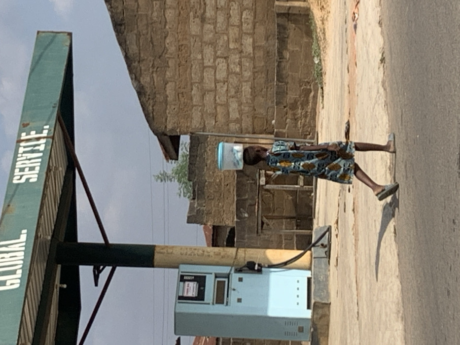 The image depicts an outdoor scene at a gas station in the City of Oyo, Nigeria, under a bright, clear sky