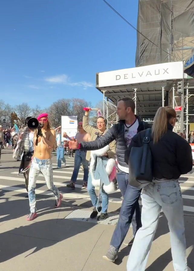 group of people gathered on a city street. A person with pink accessories speaks into a microphone, expressing their desire to change all genders back to male. The speaker calls on others to follow President Donald Trump. Other people surround the speaker while bystanders walk around. A coffee truck is parked nearby. The weather appears to be sunny and clear.
