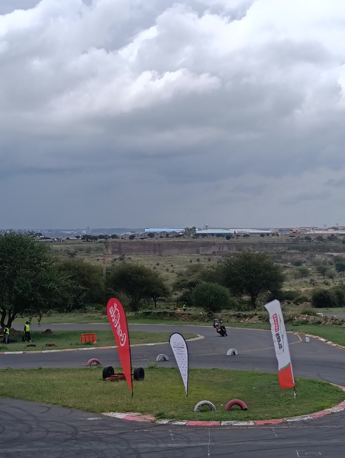 The image displays an outdoor racing track in Matathani ward, Kenya, under a heavily overcast sky