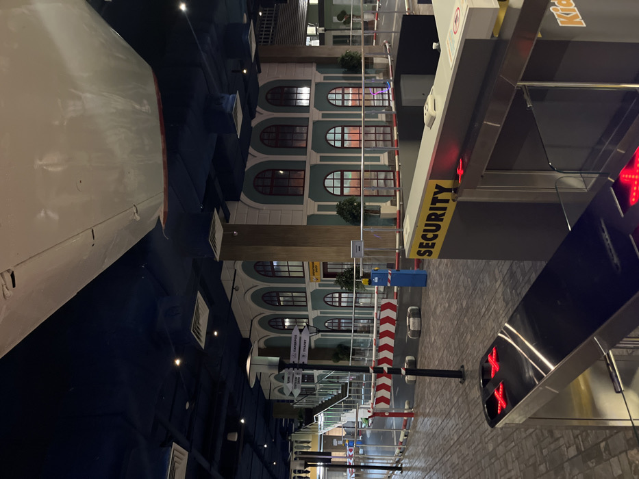 A model town interior features miniature buildings with arched windows and trees. A "SECURITY" sign hangs above a gated entrance with red X-shaped lights. Red and white striped poles line a brick-paved street. Arrows point the way to various locations. A white object looms on the left, partially out of view.