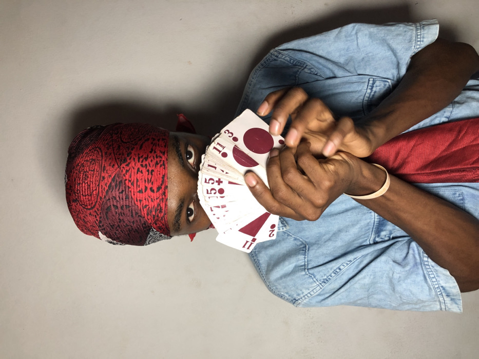 An individual with dark skin is depicted in a medium shot against a plain light grey wall in Ngleshi Amanfro, Ghana. The person wears a red and black patterned head covering, a light blue denim short-sleeved shirt, and a red tie. A light-colored wristband is visible on the left wrist. Both hands hold a fanned group of white playing cards with red markings, partially obscuring the lower face. Visible card markings include red numbers such as '2', '5', '7', and '11', along with circular pips; one card displays a prominent red circle. The individual's eyes are visible and directed at the viewer.