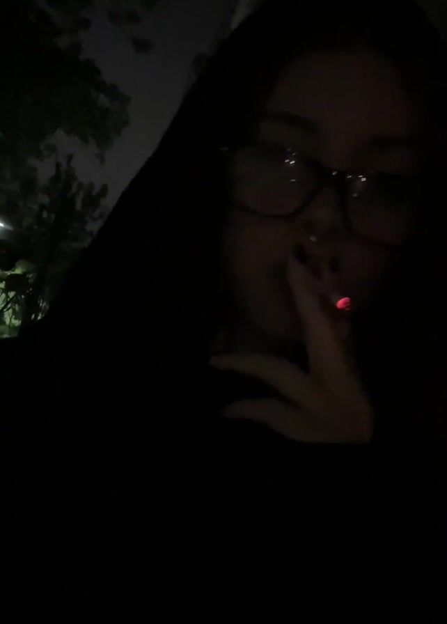 A person with dark hair and glasses, wearing a dark hooded sweatshirt, holds a lit cigarette to their lips outdoors at night. Street lights and trees are visible in the dark background. The person takes a drag from the cigarette and briefly removes it from their mouth. The person has a nose ring and dark nail polish. The scene is dimly lit.