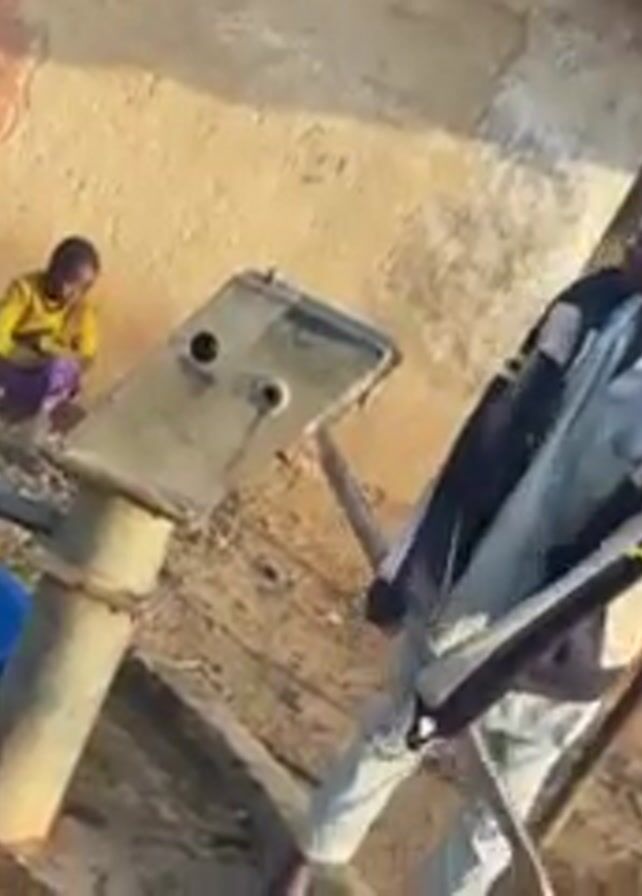 A young person operates a hand-powered water pump, drawing water into a blue plastic tub. Two small children are seated near the pump. The surroundings appear to be a rural or less developed area. The pump is metallic and shows signs of age. The area around the pump is somewhat dry and dusty. There is a building behind the pump with a visible door and corrugated metal roofing.