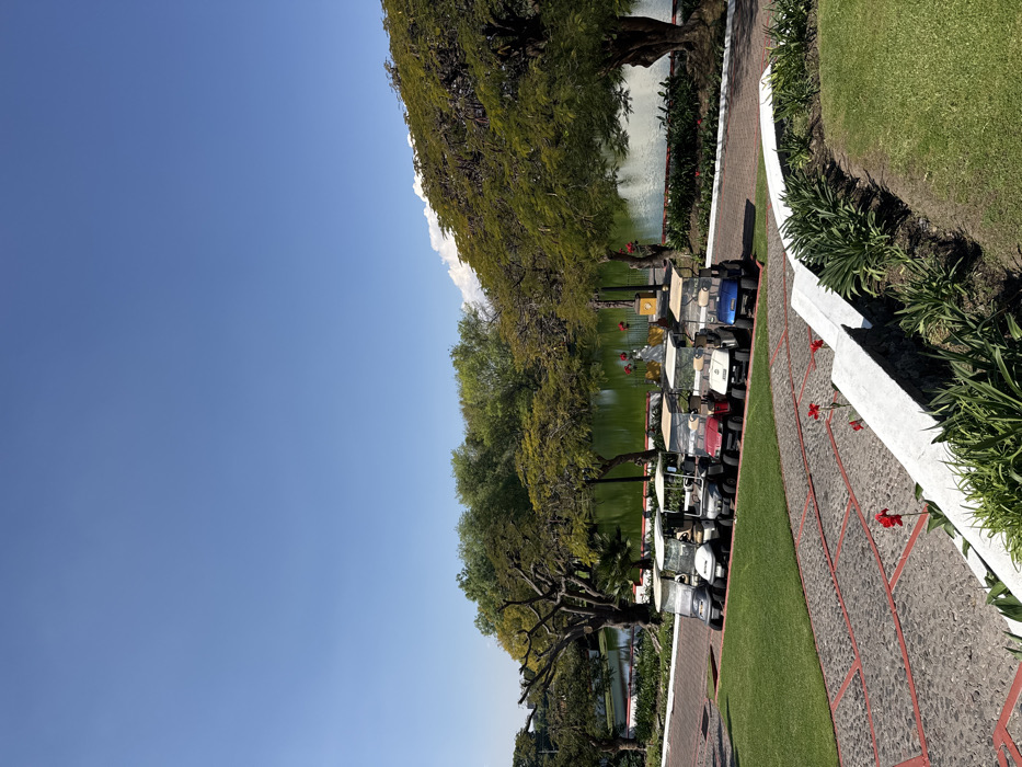 A row of golf carts is parked on a paved path bordered by green grass. A line of trees overhangs the path, with a body of water visible behind them. The sky is bright blue and mostly clear. The image is rotated, with the sky taking up a significant portion of the left side. Red flowers are scattered along the path. The scene appears to be a sunny day at a golf course or resort.