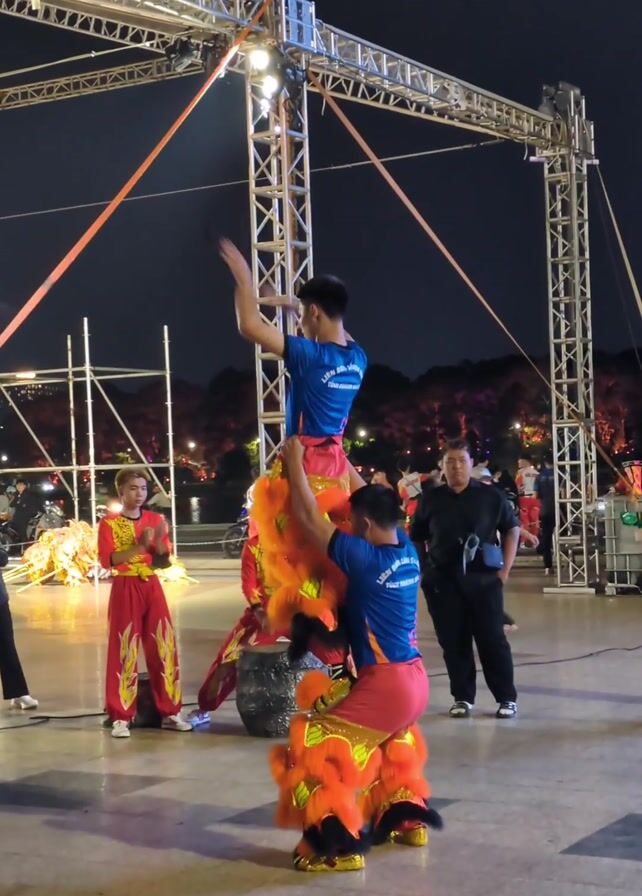 At night, a Chinese lion dance performance takes place on a polished stone surface, seemingly a public square or event space. Two men in matching blue t-shirts and vibrant, orange and yellow lion costumes are the focal point. One man stands atop the other, both maintaining balance as the “lion” moves. Two other performers, dressed in red and gold traditional attire, stand by, with one clapping. A large metal truss structure stands overhead, supporting stage lighting. The background reveals a scattering of spectators of various ages, along with scaffolding and other event-related equipment. A security guard in a black shirt and pants observes from the side. The overall environment suggests a festive or celebratory occasion.
