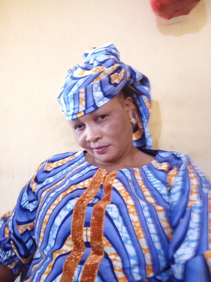 An adult female is depicted in a head-and-shoulders portrait within an indoor setting in the city of Unknown, Unknown. She has light brown skin and is looking directly at the camera with a neutral expression. She is wearing a patterned garment and a matching headwrap. The fabric features vertical stripes in shades of blue and light orange/yellow, with two vertical strips of shiny orange trim down the front center of the chest. Her headwrap is elaborately tied. Small, decorative earrings are visible in her right ear. The background consists of a plain, light yellow-beige wall, with a small, indistinct red object visible on the wall in the upper right corner.