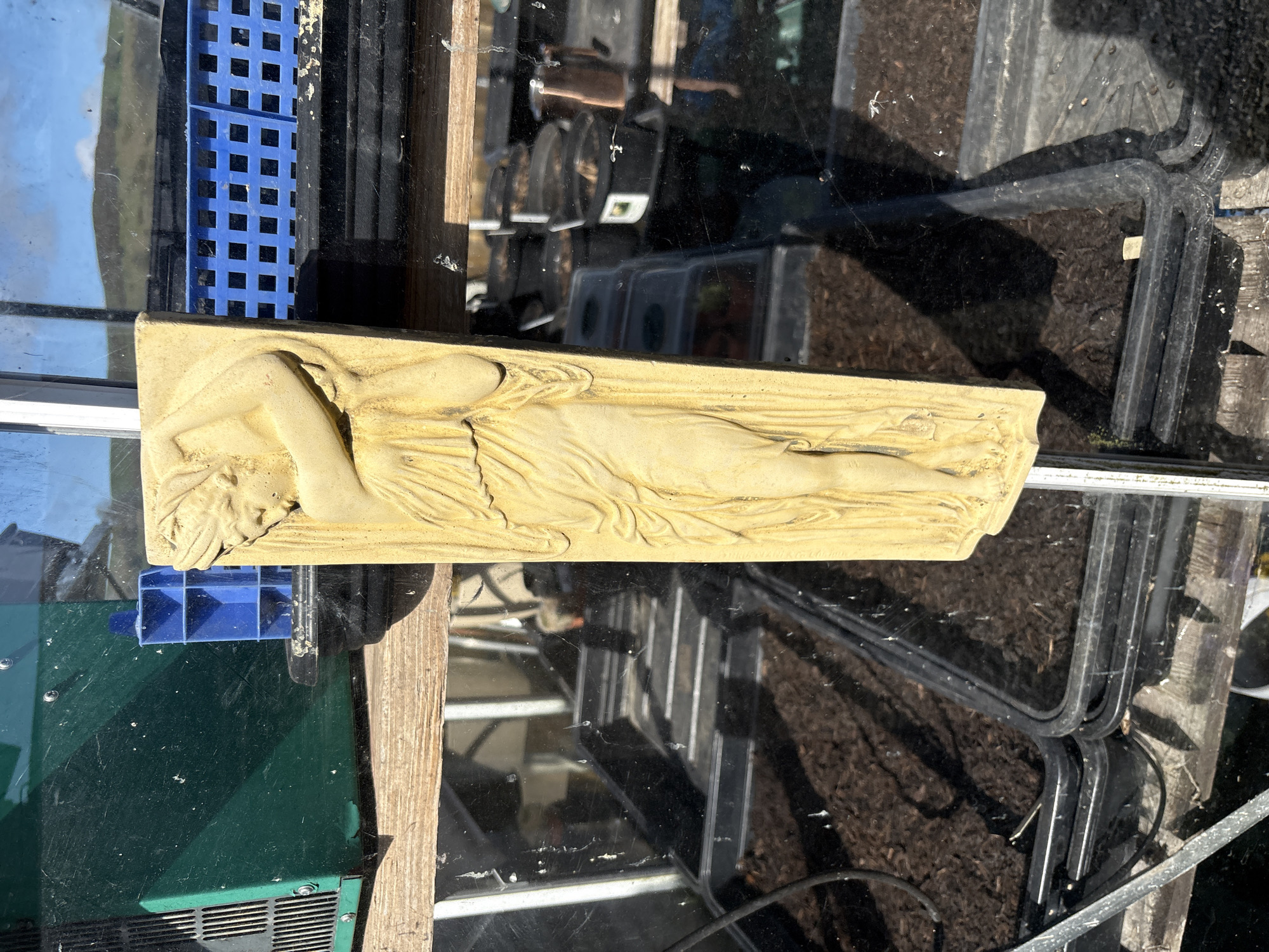 rectangular bas-relief sculpture of a reclining nude figure, possibly female, on a windowsill or similar flat surface. The sculpture is a pale yellowish-tan color. The surface is reflective and appears to be glass, with various objects visible through it, including a blue plastic grid, a dark green box-like object with ventilation slots, black metal frames, and planting trays filled with soil. The scene appears to be inside a greenhouse or conservatory. The location is Shrewsbury, United Kingdom. There are no people visible in the image.