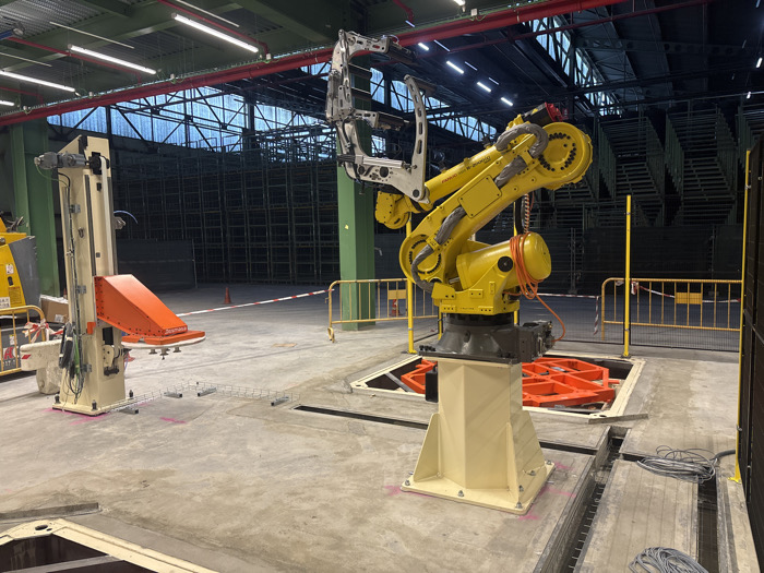 This image depicts the interior of an industrial facility located in Burgos, Spain. The scene features a large, high-ceilinged area with a concrete floor marked by utility channels and pink installation guides. In the foreground, a prominent yellow FANUC M-2000iA industrial robotic arm is mounted on a light beige pedestal, bolted to the floor. Its multi-jointed arm extends upwards, gripping a large, intricate metallic jig or frame. An orange electrical cable is coiled near the robot's base. This robot is positioned next to an open square floor pit, which reveals orange structural support elements below. To the left of the robot, a tall, light beige industrial stand or column is secured to the concrete, featuring an orange "Schmalz"-branded component. A series of interconnected metal wire mesh cable trays form a low, curved path on the floor between these two pieces of machinery. Yellow temporary metal barriers and a red and white striped caution tape delineate parts of the work area. Loose electrical cables are visible within the floor channels and piled near a vertical barrier on the right side. The overhead structure includes exposed metal trusses, roof panels, red piping, and green support columns. The background shows extensive, multi-tiered dark shelving or scaffolding, suggesting a large storage or staging area. No individuals are present in the scene. The overall impression is that of an industrial setup undergoing installation or reconfiguration.