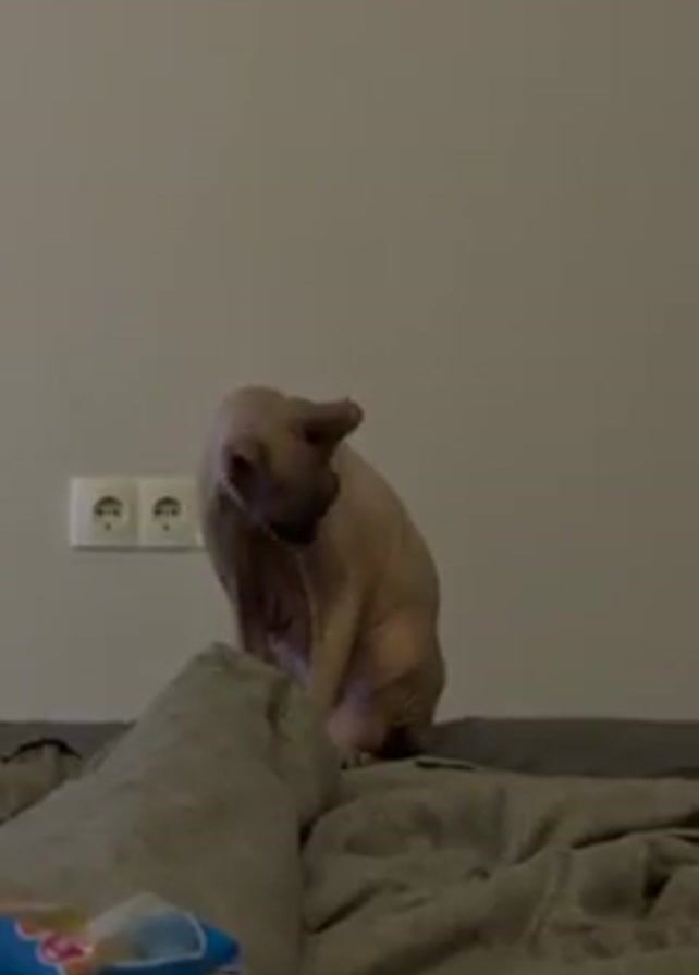 A hairless cat sits on a gray bedspread with a blue package partially visible in the foreground. The cat is light pink and appears to be grooming itself, with its head bent down and a paw near its neck. Behind the bed, a plain white wall features a double electrical outlet. The lighting is somewhat dim, giving the scene a muted tone.