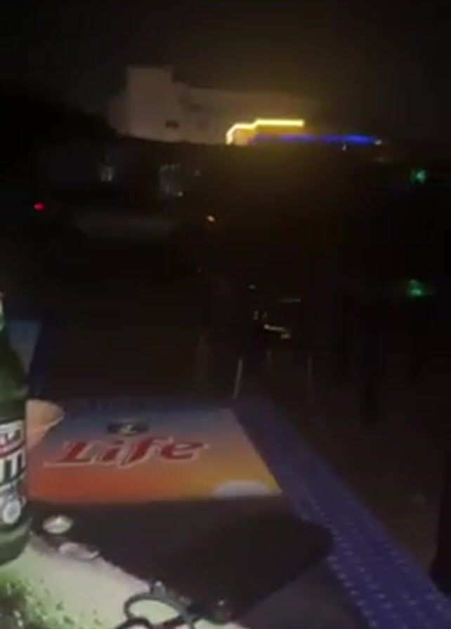 table outside at night, with a green bottle labeled "LIFE", a bottle opener, and what appears to be a cell phone. In the background, there are lights visible across the street, including some that are green and blue. A person wearing a long purple garment and a white hat walks by the table, carrying something that looks like a rope or strap in their hand. The lighting is poor, and the video quality is shaky.