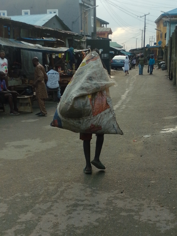 A person carries a large, triangular sack that obscures their head and torso. The person wears sandals and dark-colored shorts. The scene is a busy street market with stalls and buildings lining either side. Other people walk along the street. A blue sedan is parked further down the street. The road is paved and appears wet. Overhead electrical wires crisscross the sky.